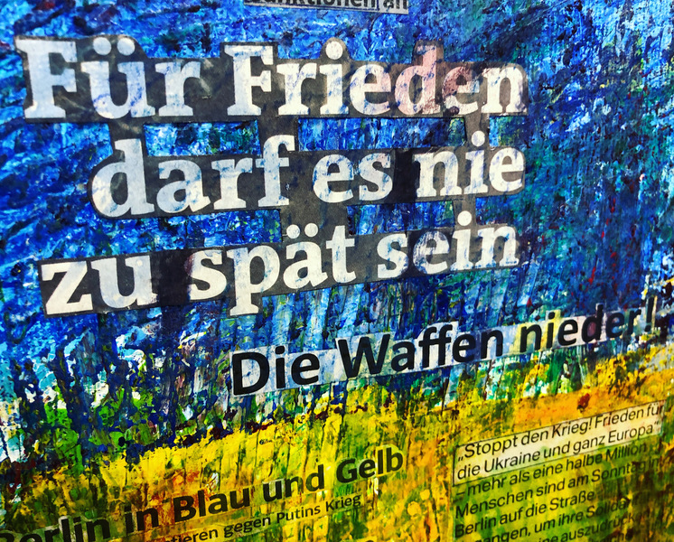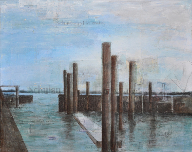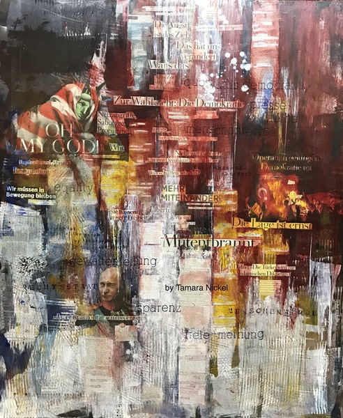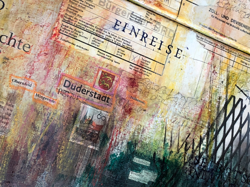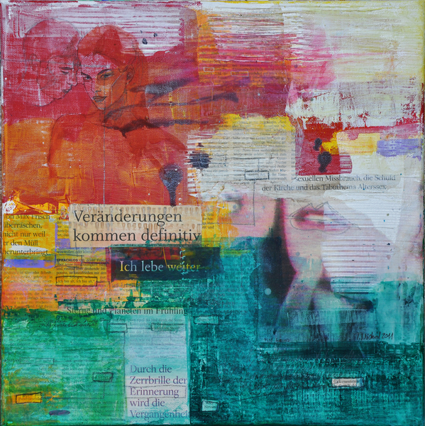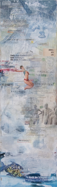 Ich arbeite mit Überlagerungen, Kontrasten, mit Licht und Schatten, mit dem Sichtbaren und dem Verborgenen. Textfragmente, Zeitungsausschnitte und grafische Elemente verweben sich mit malerischen